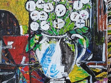 "This one is particularly vibrant, with contrasting colors and modernist lines. This painting breathes new life, using a bold contemporary style, into the conventional confines of 'still life'."